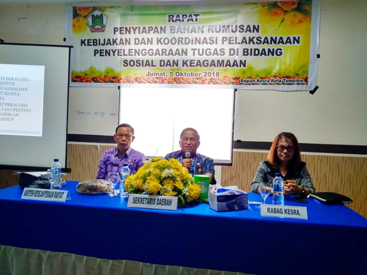 TOMOHON, (wartasulut)— Pemkot Tomohon melalui Bagian Kesejahteraan Sekretariat Daerah, melaksanakan kegiatan rapat penyiapan bahan rumusan kebijakan dan koordinasi pelaksanaan penyelenggaraan tugas di bidang sosial dan keagamaan. Kegiatan yang diikuti oleh perwakilan tokoh agama, tokoh masyarakat dan kecamatan se Kota Tomohon ini, dilaksanakan di ruang pertemuan lantai dua Kantor Wali Kota Tomohon, jumat (5/10/2018).