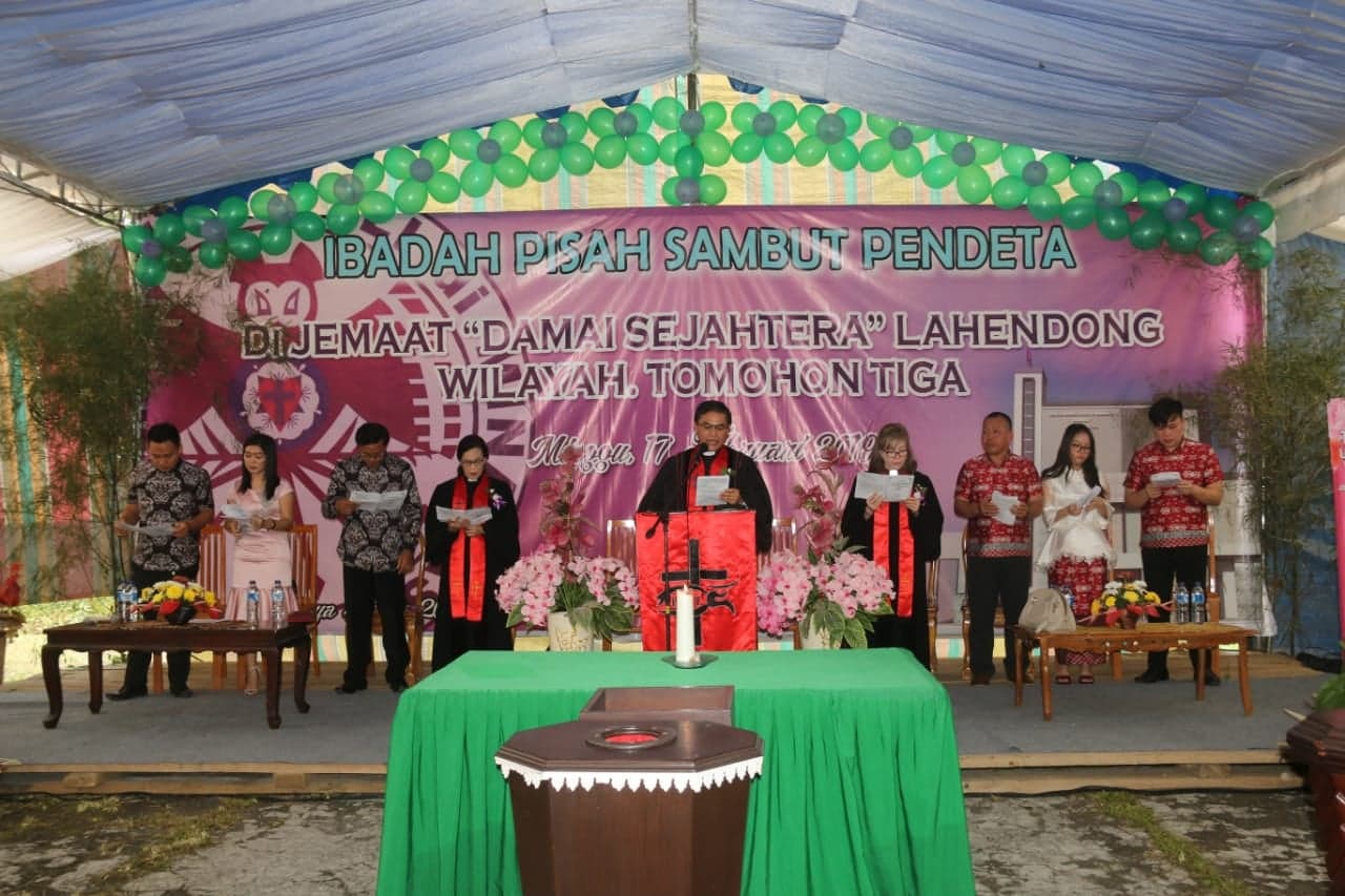 TOMOHON, (wartasulut)—Ibadah Serah Terima dan Pelantikan Ketua Badan Pekerja Majelis Jemaat GMIM Damai Sejahtera Lahendong Wilayah Tomohon III dari Pdt Dores Adelin Sambeka MTh (Ny Kumeang) kepada Pdt Anie Lesar STh (Ny Tuju), di laksanakan di kompleks pertamina, kelurahan Lahendong Kecamatan Tomohon Selatan. Ibadah dipimpin oleh Wakil Ketua Badan Pekerja Majelis Sinode GMIM Bidang Ajaran, Pembinaan dan Penggembalaan Pdt Anthonius Dan Sompe MTh M Pdk.