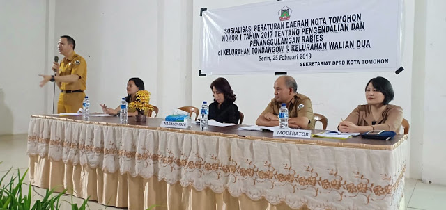 TOMOHON (wartasulut) — Sekretariat DPRD Kota Tomohon melaksanakan kegiatan Sosialisasi Peraturan Daerah (Perda) Kota Tomohon Nomor 1 Tahun 2017 tentang Pengendalian dan Penanggulangan Rabies bertempat di balai Kelurahan Tondangow, Kecamatan Tomohon Selatan, Senin (25/02/2019).