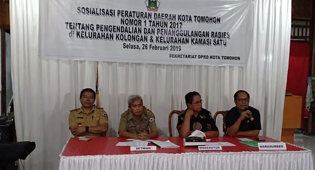 TOMOHON (wartasulut) – Mengantisipasi penyebaran virus rabies kepada masyarakat Kota Tomohon yang disebabkan gigitan hewan yang terserang virus rabies, baik hewan liar maupun hewan yang dipelihara oleh masyarakat seperti anjing, kucing, kera dan lain-lain. Maka, Sekretariat DPRD Kota Tomohon melaksanakan sosialisasi Peraturan Daerah (Perda) Kota Tomohon Nomor 1 Tahun 2017 tentang Pengendalian dan Penanggulangan Rabies di Kelurahan Kolongan dan Kelurahan Kamasi, bertempat di RM Family, Selasa (26/02/2019).