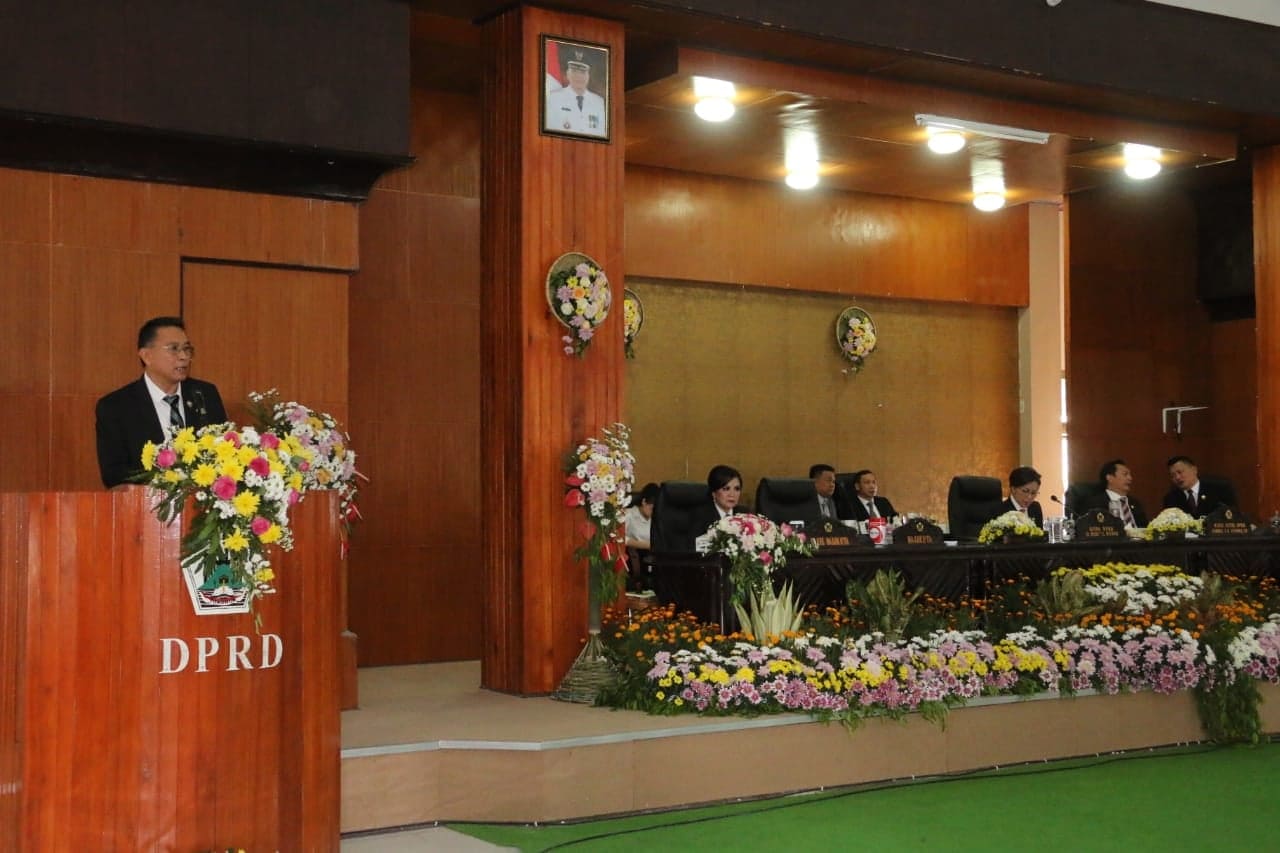 TOMOHON (wartasulut)— Wali Kota Tomohon Jimmy F Eman SE Ak didampingi Wakil Wali Kota Syerly Adelyn Sompotan menghadiri rapat Paripurna Istimewa DPRD Kota Tomohon Dalam Rangka Peresmian Pelantikan dan Pengucapan Sumpah Janji Pengganti Antar Waktu (PAW) anggota DPRD atas nama Elieser Posumah ST, yang dilaksanakan di ruang rapat DPRD, Jumat (16/8/2019).