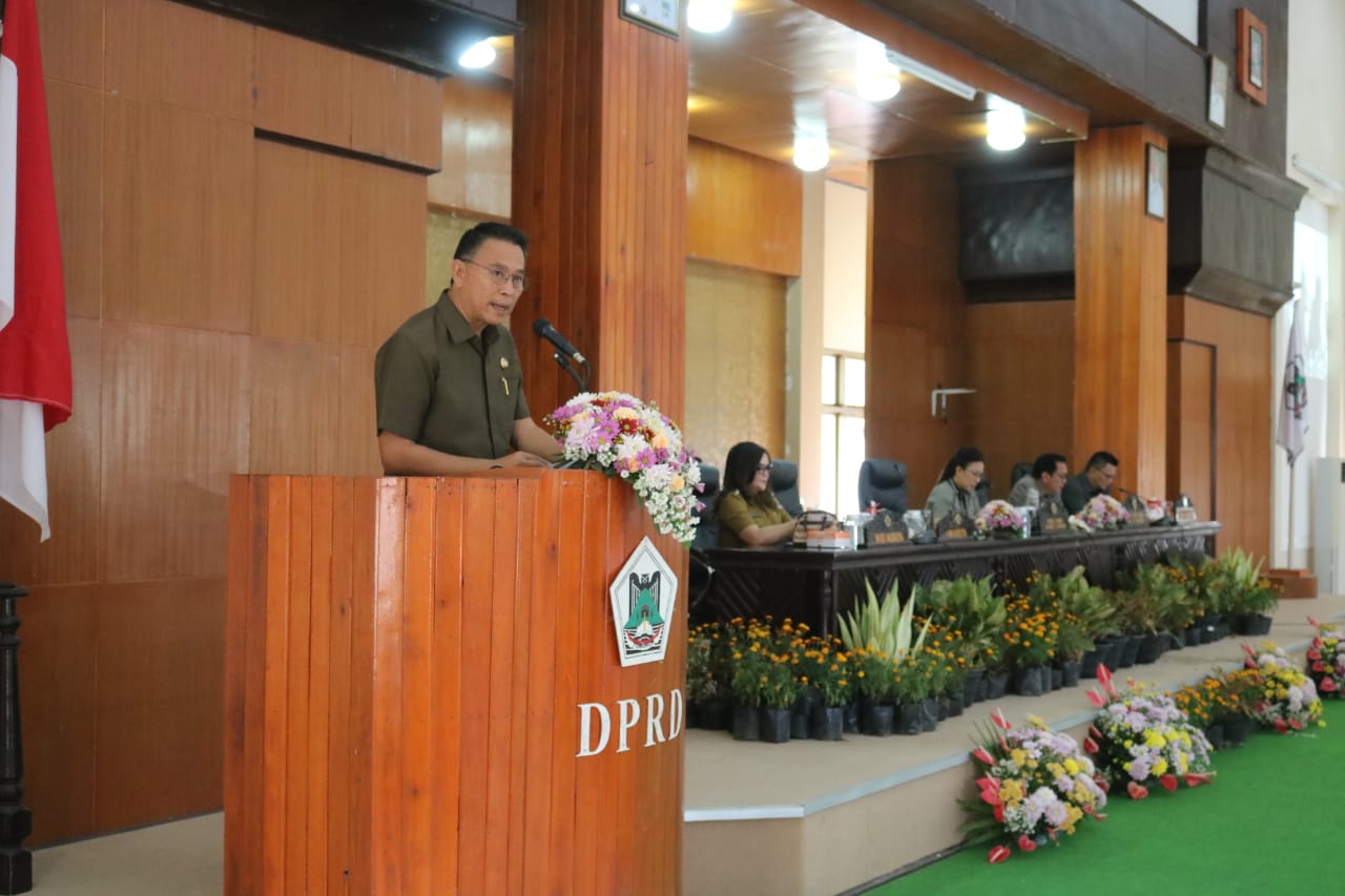 TOMOHON (wartasulut)–Wali Kota Tomohon Jimmy F Eman SE Ak CA memberikan Tanggapan/Jawaban dalam Rapat Paripurna DPRD dalam rangka mendengarkan Tanggapan/Jawaban Wali kota terhadap Pemandangan Umum Fraksi-fraksi mengenai Ranperda tentang Perubahan APBD T A 2019 Kota Tomohon, bertempat di Ruang Sidang Kantor DPRD Kota Tomohon, Selasa (20/08/2019).