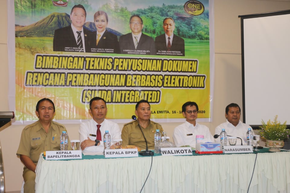 TOMOHON (wartasulut)—Wali Kota Tomohon Jimmy Feidie Eman SE Ak CA menghadiri dan membuka kegiatan Bimbingan Teknis Penyusunan Dokumen Rencana Pembangunan Berbasis Elektronik (Simda Integrated), di Villa Emitta Tomohon, Senin (16/03/2020).