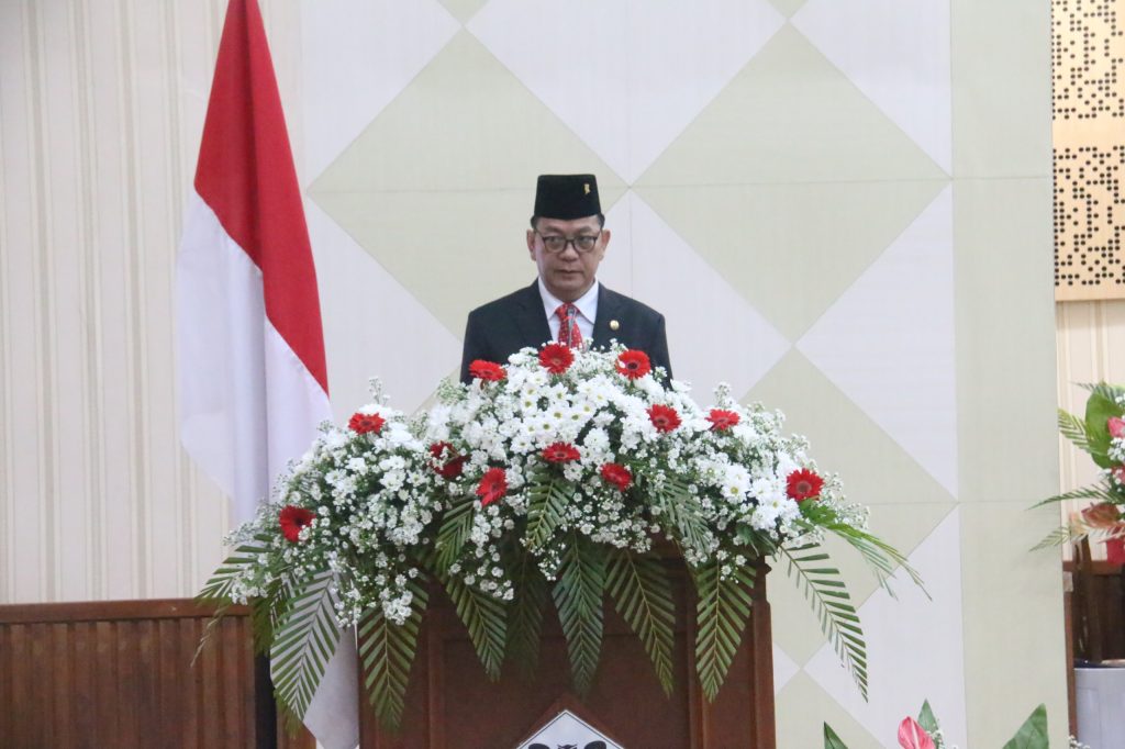 Wali Kota Tomohon Caroll J A Senduk, SH saat membacakan sambutan Menteri Dalam Negeri saat pelaksanaan Rapat Paripurna Dalam Rangka Pengucapan Sumpah/Janji Anggota DPRD Kota Tomohon masa jabatan tahun 2024-2029.