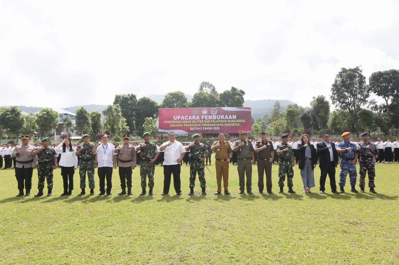 TOMOHON (wartasulut.co.id)—Wali Kota Tomohon Caroll J A Senduk SH MH menghadiri upacara pembukaan Pendidikan Dasar Militer dan Pelatihan Manajerial Sarjana Penggerak Pembangunan Indonesia Batch-3 Tahun 2025, di Lapangan Mako Rindam Tomohon, Senin 14 April 2025.