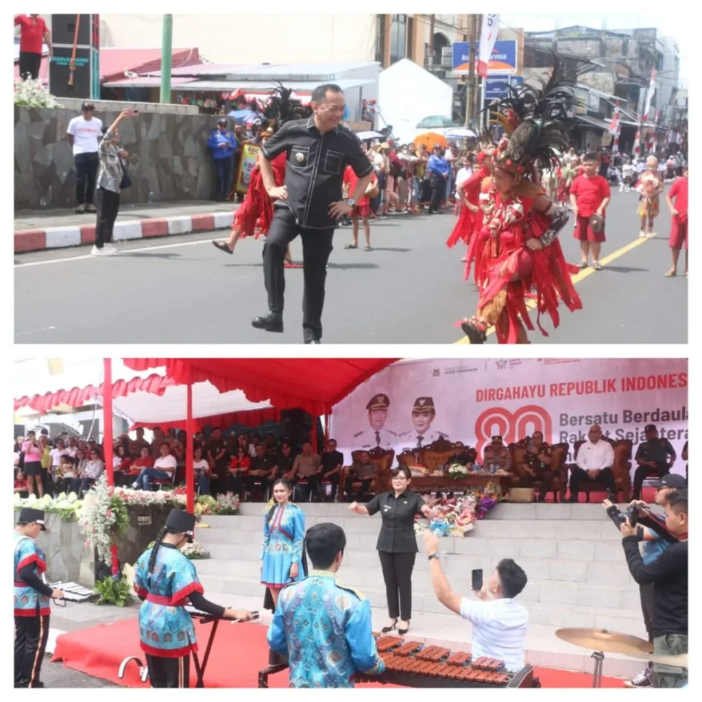 TOMOHON (wartasulut.co.id) – Walikota Tomohon Caroll Senduk SH bersama Wakil Walikota Sendy Rumajar SE MIKom ikut memeriahkan Defile Kemerdekaan Republik Indonesia ke 80 dan Pawai Pembangunan yang digelar Pemerintah Kota Tomohon, Selasa (19/8/2025).