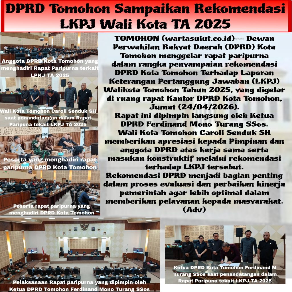 admin April 24, 2026April 27, 2026 Advertorial DPRD Tomohon Sampaikan Rekomendasi LKPJ Wali Kota TA 2025